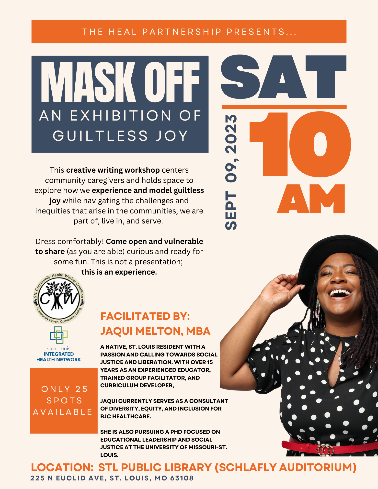 MASK OFF | An exhibition of guiltless joy; taking place Sept 09, 2023 - 10:00 AM | Facilitated by Jaqui Melton, MBA | ONLY 25 SPOTS AVAILABLE! REGISTER NOW!!